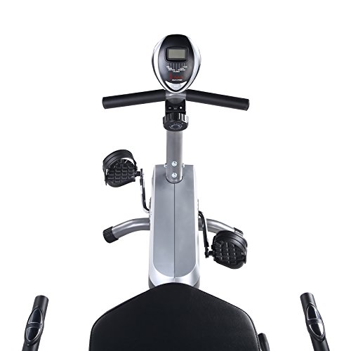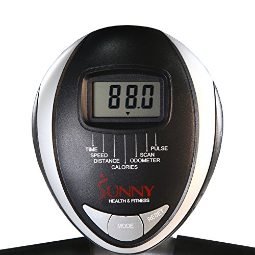 Sit back and workout with the SF-RB4616 Easy Adjustable Seat Recumbent Bike. This bike allows for forward and backward adjustment of the seat without having to get up. The self leveling pedals make it easy to place your feet in the straps. Maximize your workouts with the adjustable 8 level magnetic tension control system. Track your workout progress with the LCD digital monitor that displays: Scan, time, speed, distance, calories, odometer and heart rate. Convenient handles with pulse grip sensors will allow monitoring heart rate and workout intensity. The recumbent bike has built in transportation wheels for easy portability. The extended weight capacity can hold up to 300 pounds. Start today towards a healthier and happier you with the Sunny Health and Fitness SF-RB4616 Easy Adjustable Seat Recumbent Bike.